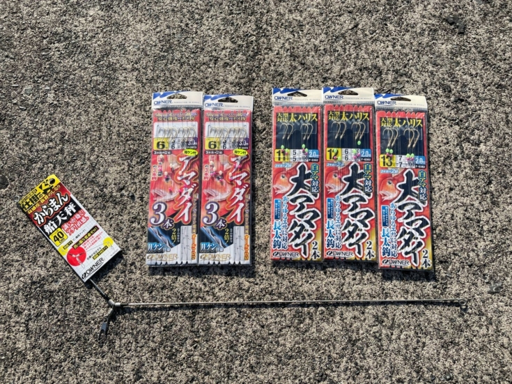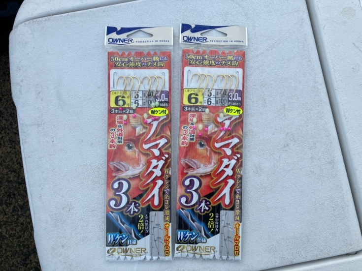 ※自作する場合は…ハリはOH沖アミチヌ(Wケン付・ヒネリなし)6号、マダイばり12号、ハリスはナイロン5~6号を使用。