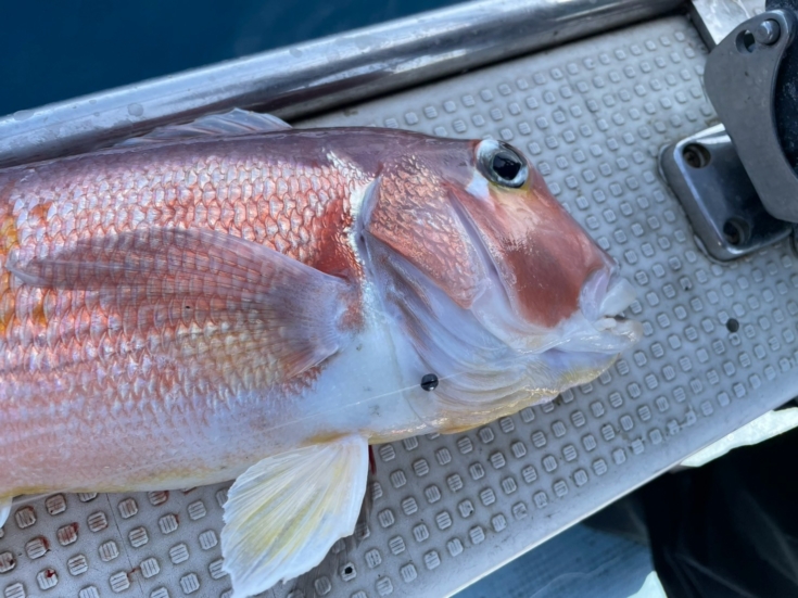 そこで、アタリが来たら電動リールをゆっくり回転させ、サオで聞きつつ重みが確認できたら、最後にギュンと回転数を上げ巻きアワセを入れます。こうすることでハリ先がアマダイの口腔内や唇を捉え、バレにくい場所に掛かります。