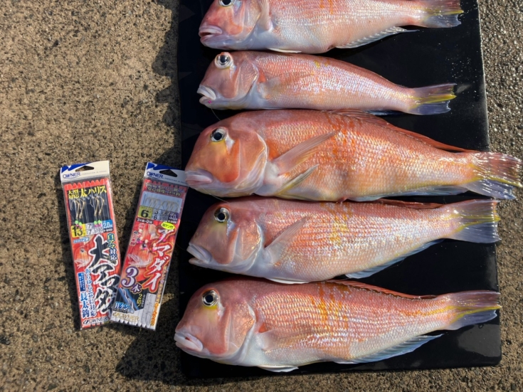 ハリス5~6号の太めのものが適しています。山陰の特に浜田~益田沖は大型のアマダイが多いというのも理由ですが、魚影も濃いため多点掛けを狙って1匹目が喰った後にそのまま待つことが多く、ハリを飲まれることがあります。アマダイや外道でよく掛かるレンコダイの口には小さな歯が並び、飲まれるとハリスが傷つきます。