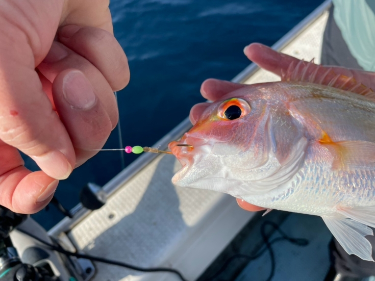 アワセについては素早い動作はNGです。冷凍エビなど大きなエサを使っているため、ビュンとアワセるとハリ先がアマダイの口や喉に突っかからずに、エサごとすっぽ抜けやすいです。