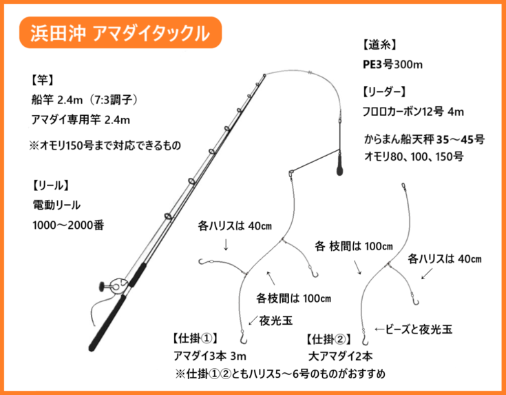 ・竿/2.4m前後でアマダイ専用または7:3調子の船竿で80~150号のオモリに対応できるもの
