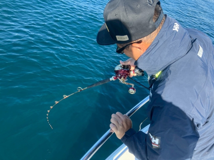 仕掛けにベイトが付いたら、ベイトボールの下でエサを追い回しているフィッシュイーターのタナに下ろしていきます。少し待って、ベイトが暴れなければさらに探り下げていきます。ただし、船長から「青物がベイトの群れに突っ込んでいる」とアナウンスがあるような状況では、あえてベイトのタナで待つ方法も有効です。