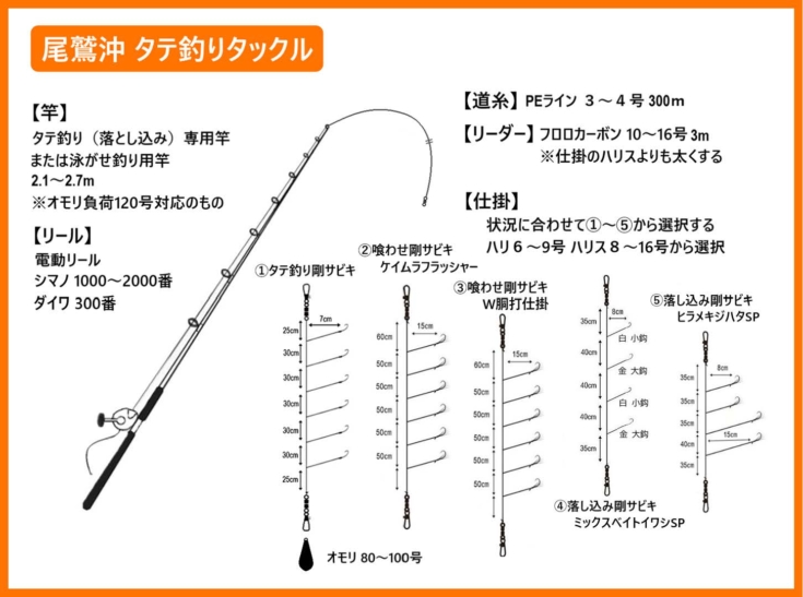 ・竿/タテ釣り専用または泳がせ釣り用の船竿で全長2.1~2.7m、120号までのオモリに対応できるもの