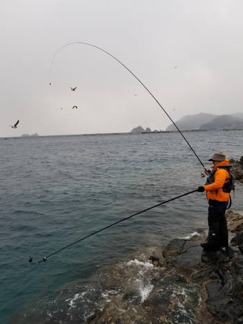 そして、セットした仕掛を磯際、沖向きと色んな箇所へ投入しますが、見た目以上に流れが強く、仕掛が馴染む前に右隣の磯で竿を出している釣り人へ仕掛が絡みそうになります。
