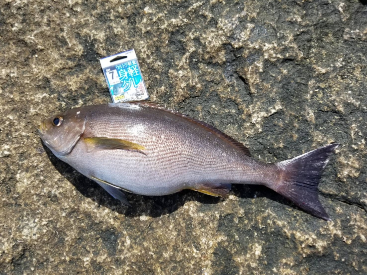 そこで始めは自重のあるザ・ロックで深く素早くタナを探ることを試みたが、予想以上に反応が無かった為、今秋発売予定の弊社グレバリ史上最軽量の新製品 「身軽グレ」で、深いタナを超スローで馴染ませながらアプローチすることで、ヒットに持ち込んだとのこと。