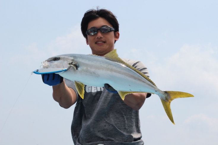 スタッフにも一通り説明したのち、全員で水道側を狙うと、飽きない程度にメジロやヒラマサが誰かのルアーにチェイスやヒットが続き、昼の一時を除いては、常に魚が反応する思ってもみない展開に発展。