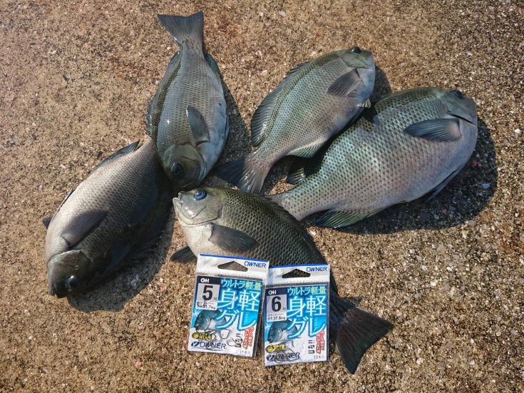 最初のうちは6号で釣り、さらに活性が落ちたタイミングで5号にサイズを落とし、グレを追加。