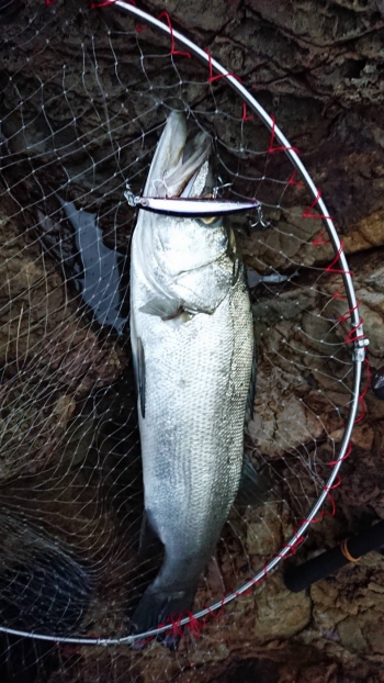 渋谷さんのほうへ振り向くとルアー竿がブチ曲がっています。「エッもうヒットしたの」と茫然としていると海面に現れてきたのは良型のヒラスズキでした。