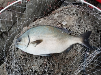 私も渋谷さんに続いて良型の魚がヒットしたかと期待しながら寄せてくると、白い腹を返す魚影が目視されたので「アァ~、奴かぁ。」とがっかり気分でタモ入れしたのは、磯釣師なら誰しもが知る、ド定番のエサ取り代表キツでした。