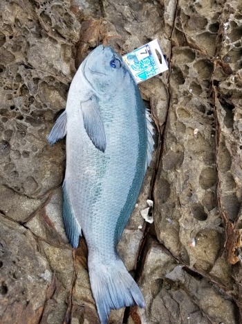 なので、水道筋を諦め沖向きに釣り座を変更し、遠投で狙うとイサギが釣れてきました。