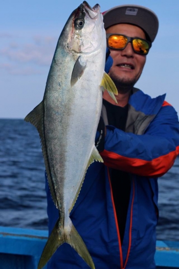 今日はなかなか厳しい1日になりそうかと思っていた矢先、林田船長がついにヒラマサの大群を捉えます!