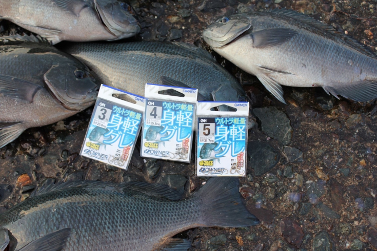 今回新発売となった鈎「身軽グレ」は、最軽量で強く、今までのものより食いは良いと思う。