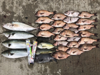 時折、イエロー系のエサとマダイより少し上の棚で美味しいシマアジも。