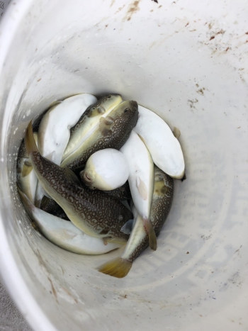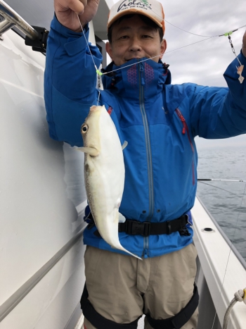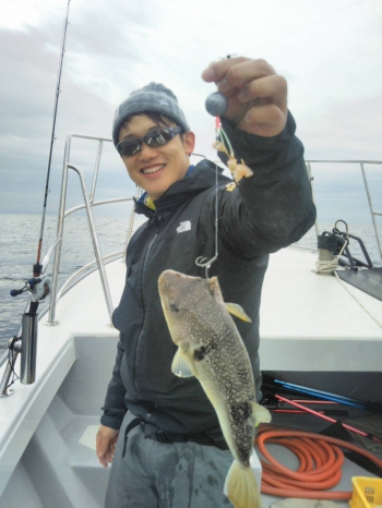 水面にクルクルと回りながら上がってきたのは30センチオーバーの本命ショウサイフグに思わず笑みがこぼれます。
