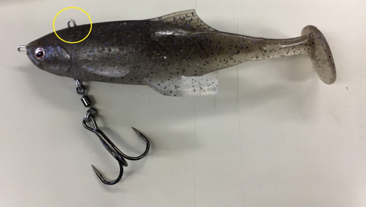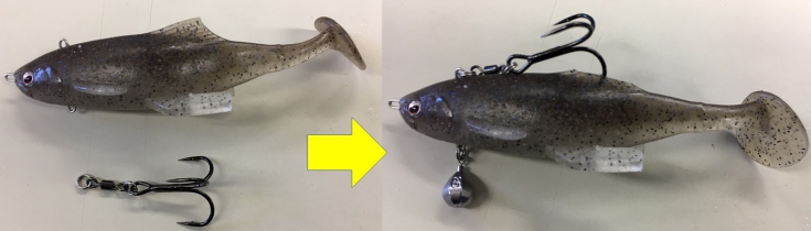背鈎チューンをする際は、お腹にセットされているトリプルフックをクレンスイベルとスプリットリングごと外し、背中側のアイにそのままセットします。私の場合、鈎をより真っすぐ刺しやすいように、背びれを2mmほどカットして使用しています。鈎を外したお腹側には、バランサーとしてシンカーを必ずセットしてください。