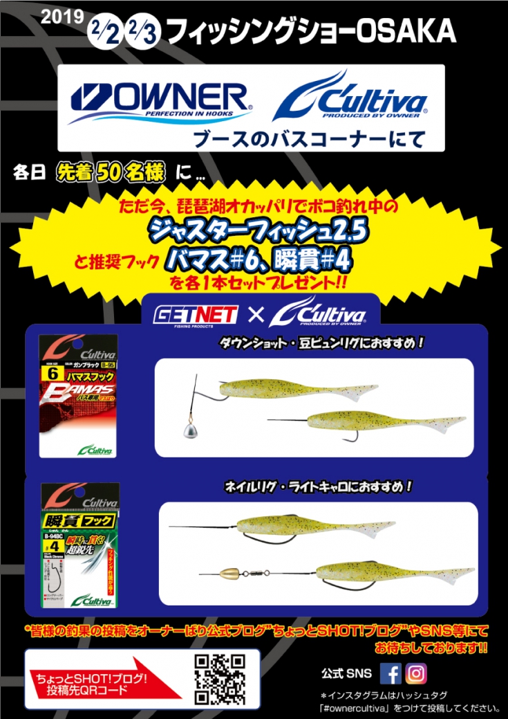 今回、魚の反応を唯一得られたジャスターフィッシュ2.5″ですが、2月2日(土)3日(日)、にインテックス大阪にて行われるフィッシングショー大阪2019で展示いたします。また、各日先着50名様にジャスターフィッシュ2.5″、推奨フックのバマスフック#6と瞬貫フック#4の各1本セットを弊社ブースのバスコーナーにてプレゼントいたします。