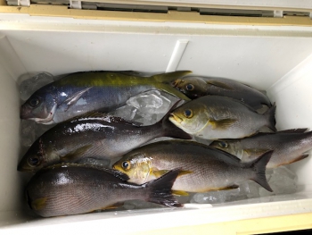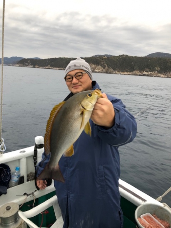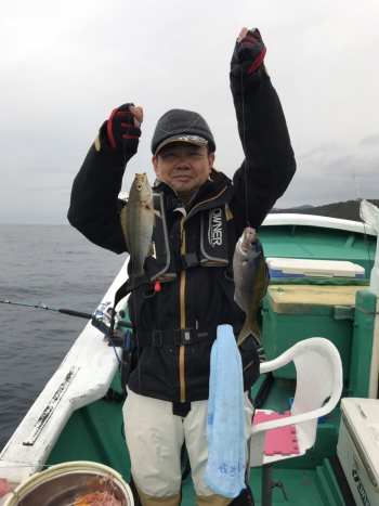 あいにくの曇り空の中、前日からの寒冷前線の影響で気温も低くまた最盛期にはまだ早かったためあまり期待せずの釣行でしたが、2本バリの天秤仕掛けで最大43㎝のイサキを頭に30本と、味の良さと見た目の美しさで人気のウメイロも2本釣れ、35㎝のグレも混じって船内全員が楽しみながらも真剣に、知り合い同士だからこその競争心も芽生え、大変盛り上がりました。