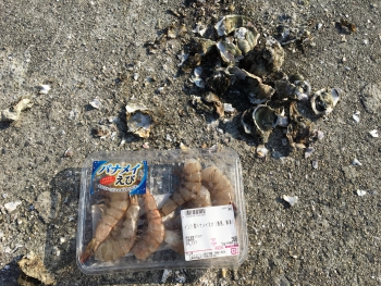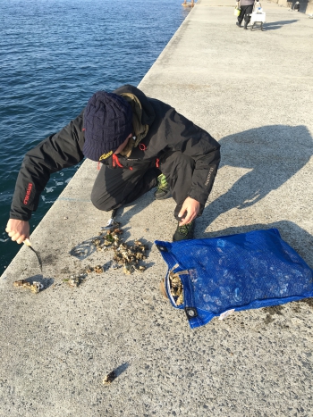 時々カキばかりに当たることがありますが、この日はマキエが効いて波止際にしか回遊がないのかもしれないと推測し、キャストすることをやめて波止際の底にエビを置いてアタリを待つことにしました。