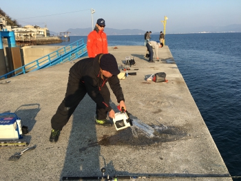 到着するやいなや、三浦君はエサのカキを潰してマキエを投入。