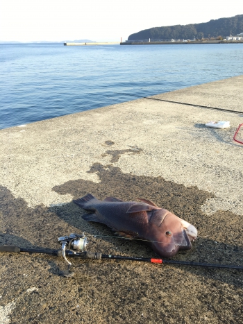 潮上からまたも敷石に沿って良型コブダイが泳いできたのが見えたので、エサの存在を気づかせるために50cmほどリフトしてカーブフォールさせると、コブダイは真っ直ぐエサへ向かって進み、ふっと姿が見えなくなりました。