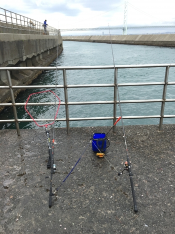 数箇所回りましたが、風が強かったり、工事中だったりで竿が出せず、北淡町の富島漁港まで北上してようやく釣りが落ち着いてできそうな場所を見つけることができました。