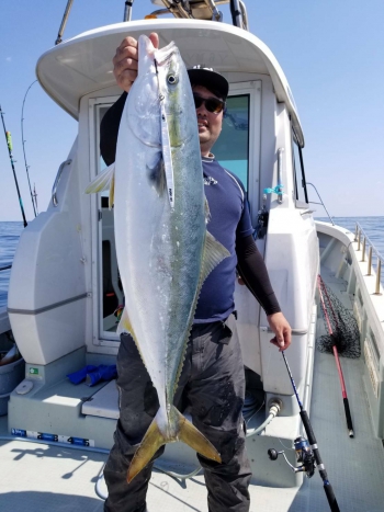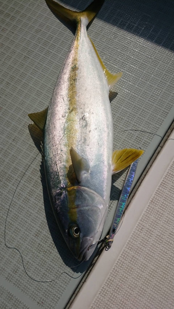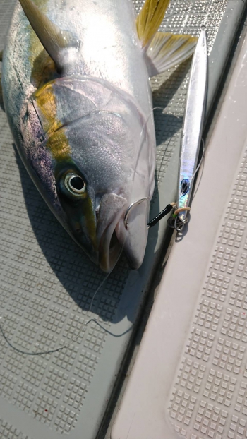 するとすぐに水柱が上がり、小ぶりですが、キレイなヒラマサをゲットです。