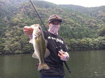 5時頃にスロープを出船し、まず向かったのは西ノ川。私は羽モノ、スタッフ中川はビッグベイトで最上流へ流していきますが、なかなかバイトが得られません。最上流にさしかかるにつれ、バスの姿もちらほら見えましたが、天才君ばかり…。最上流に見切りをつけ、本流筋に向かって下っている道中、私の羽モノにバイト!!
