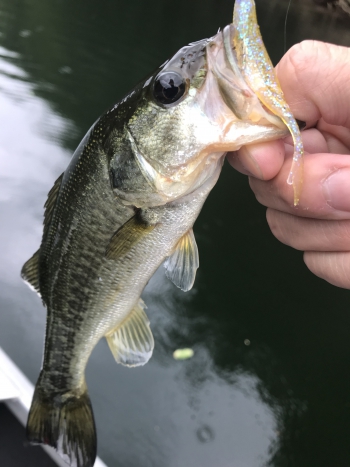 その後は倒木エリアでジャスターフィッシュ2.5のピュンネイルリグを使用しての数釣りを堪能。少しでも距離をとってアプローチしたかったので、ネイルシンカーで重さをプラス。フォールは若干速くなりますが、好反応でした。