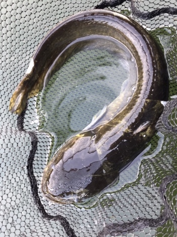 私も魚に触りたくなったので、釣れている喜多同様にジャスターフィッシュ3.5″のダウンショットに変更しようと、タックルボックスからワームを出した矢先にボイル発生。リグを結び変える時間がもったいないので、ワームだけジャスターフィッシュ4.5″から3.5″にサイズダウンしミドストで攻めてみると、直ぐにヒット!ですが...ローリングしながら上がってきた魚は.....ナマズでした...