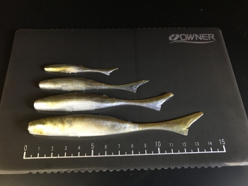見た目も動きも小魚そのもので、小魚を捕食しているバスにすごく効きます。サイズは、2.5″、3.5″、4.5″、5.5″の4サイズ。