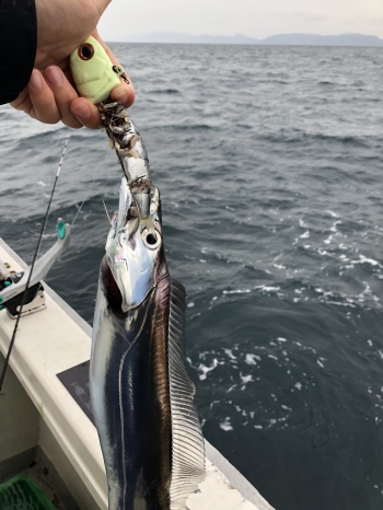 豊後水道エリアでは、群れの中でも権力を持ち、多数いるドラゴンタチウオに早くエサを見つけてもらうことが釣果への近道ではないかと考えます。