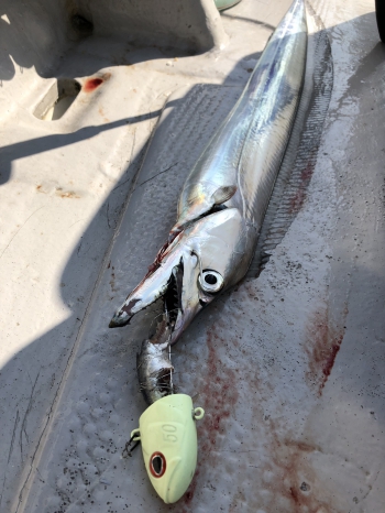 この際、水深も深く潮も比較的速い中で、水切れのよいヘッド形状の掛獲船太刀魚テンヤはジャーク、フッキングにおいて非常に効果を発揮します。