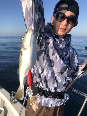 いつもの水深20mポイントに着くと、1投目から女性スタッフ井上が35cmクラスのデカフグを釣り上げます。