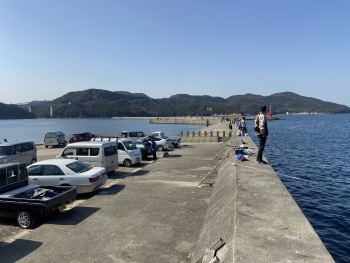 根本以外は入る場所がないほどカゴ釣りやサビキ釣りで賑わっていましたので、根本付近で釣り始めると、偶然にもカルティバフィールドテスターの賀川正志さんが様子を見に来ていたので、情報をお聞きしながらアタリを待ちますが、エサ取りの反応もないので、1時間ちょっと探ってみて心が折れ、移動を決意。