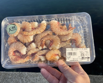 いつものタックルに、エサは前回の残りのブラックタイガーと近所のスーパーで購入したバナメイエビのようなインド産天然無頭エビ(中)で、虫ヘッドパワーはまずは4gでスタート。