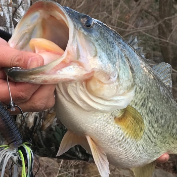 ウッドカバーを感じる速度で巻いて、カバーを超えたところでカーブフォールをしてみると、違和感がありました。フッキングしてみると、強い引きが!上がってきたのは、春らしい体高のブリブリなバスでした。
