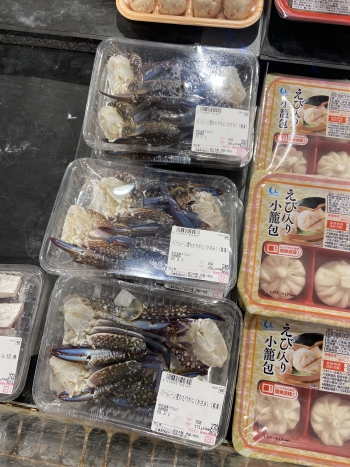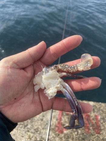今回は近所のスーパーでレアなエサのワタリガニを手に入れたので、ハサミなどの不要なパーツをパラパラと撒いておきました。