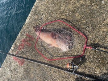 このままだと敷石の際で切られそうだったので、ハンドドラグで無理やりプレッシャーを加えて耐えていると、次は右へ走り、波止の角に回り込まれそうになりました。