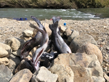 よく行く釣り場では河原でのBBQが許可されていますので、河原にある石を積み重ね、簡易のかまどを作り、釣りたてのマスを塩焼きにしています。