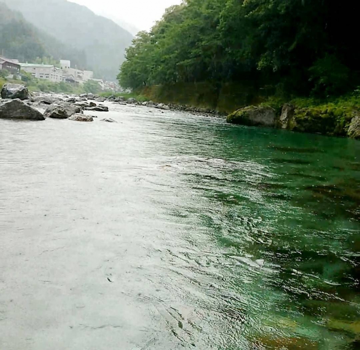 雨の中とはいえ、それでも濁らずに青々とした透明感で流れ続ける水に、「さすがの仁淀ブルー」。小屋から見とれることしきりです。山の良さを感じます。