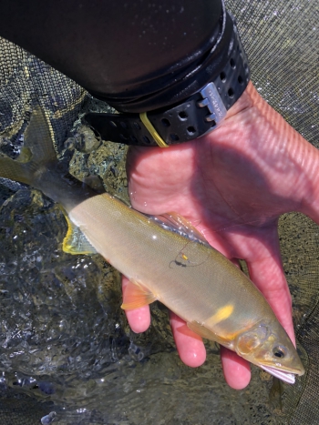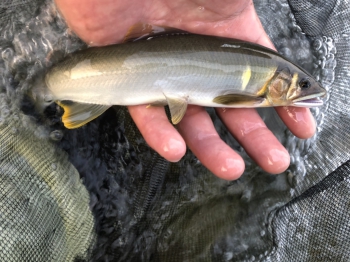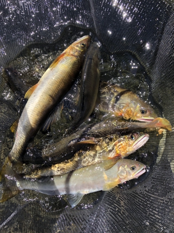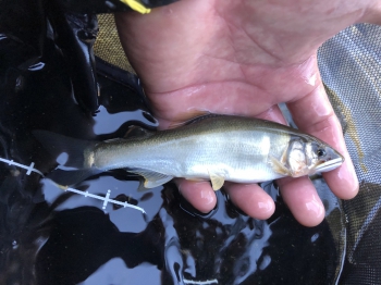 まずは瀬頭の泡の中でオトリごろのサイズをキャッチしてほっと一安心。