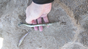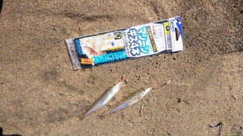 しばらく引き釣りをしてから巻き上げてみると15cm前後のまずまずサイズがダブルヒット!
