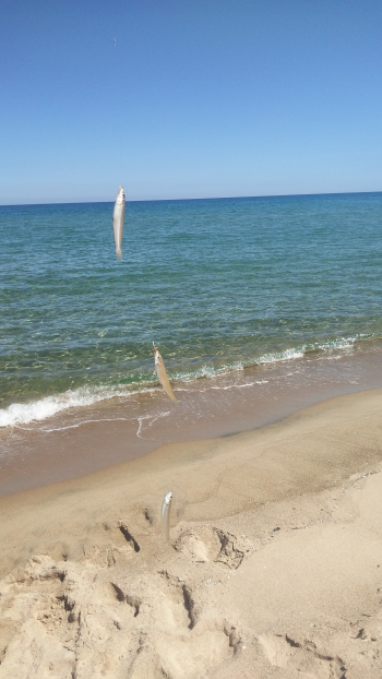 魚を散らさないようにまず50mほど沖へ投げて手前へ引いてきます。