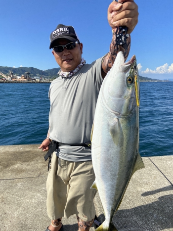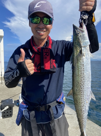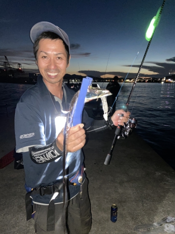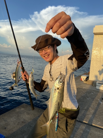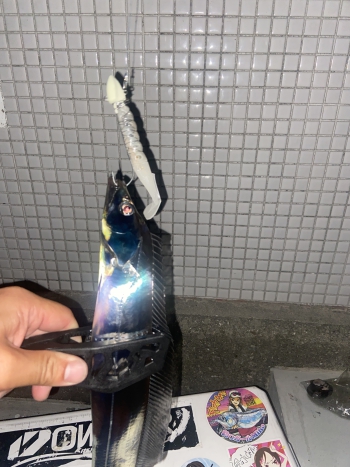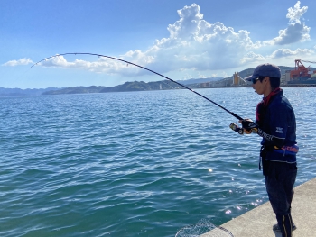 私が失態を演じている一方、同僚の川内君は撃投ジグ40gで78cmのメジロ、藤原さんは遠投ジグサビキ+投次郎のブレードチューンでサワラ、高林さんは遠投ジグサビキで良型アジなどを上げ、昼の部はあっという間に終了。