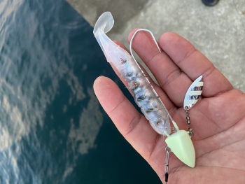 ピンテンヤ20gに包ワームシャッドをセットし、アピール力アップのためブレードチューンをプラス。
