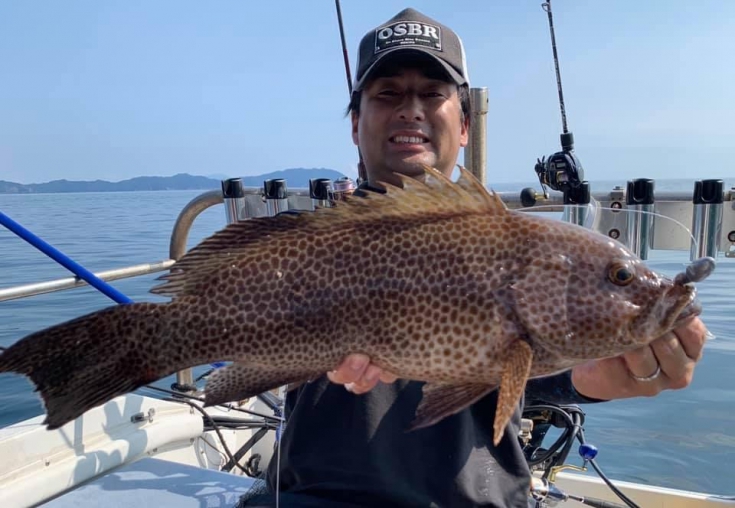 1投目は潮の流れを把握するため操船に専念し、ゲストさんの釣りを見ていると1投目からアカハタがヒット!