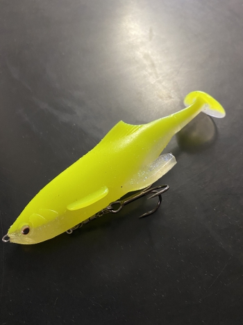 チェイスもないため、魚のポジションが深いのではと思い、ロングカーリー7.8″のヘビダン(5g)で少し深いレンジをスイミングさせながら狙ってみます。