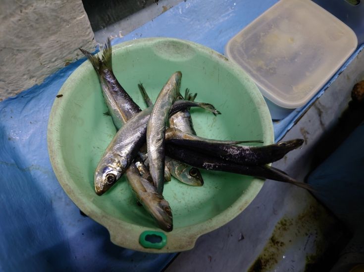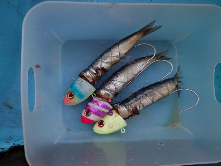 乗船したら大阪湾では、餌のイワシを配って貰えるので、ポイント到着までにテンヤにエサをセットしておきます。