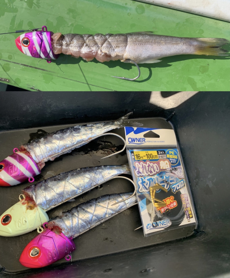 エサはイワシからスタートしますが小型太刀魚からのアタリでエサが直ぐに痛んでしまう為、身が強くてエサ持ちの良いカマスにチェンジ。