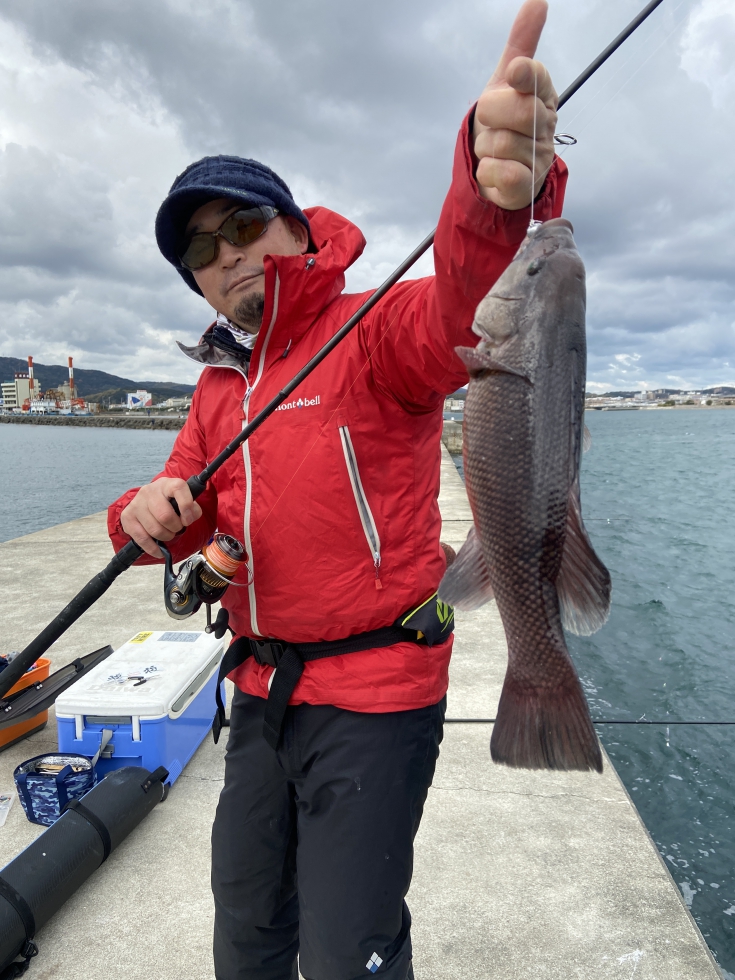 波止際から3mほど沖に軽く斜めにキャストし、着底したらしばらく待ち、50cmほど持ち上げてカーブフォールという探り釣りスタイルをすると、すぐに大きめのアタリがあり、ラインを張って様子を見ると、エサをすぐには離さなかったので、不審に思って合わせると、大きくないものの小気味良い首振りとともに30cmほどの小コブが上がってきました。
